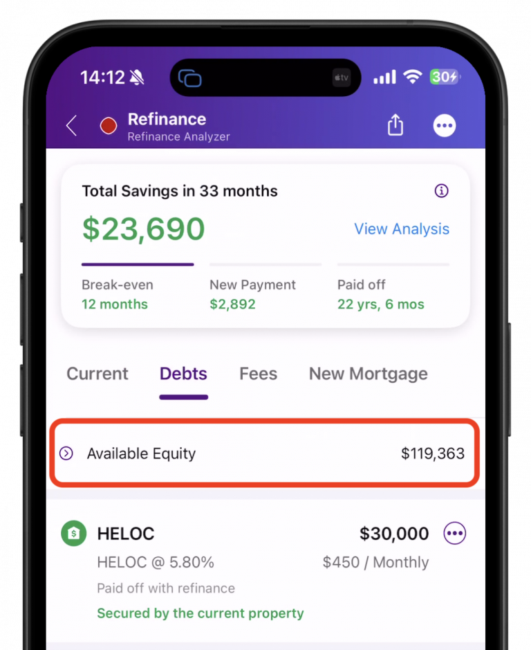 • Irrelevant fields are now hidden, keeping the experience clean and focused. For instance, in the refinance analyzer, if the current mortgage is interest-only, the remaining amortization is not displayed